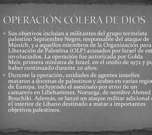 Otra de sus misiones más sonadas fue la operación Cólera de Dios de 1972, en la que el MosSad asesinó a los líderes del grupo terrorista palestino Septiembre Negro por su atentado contra atletas israelíes en los Juegos Olímpicos de Múnich de ese año. Asimismo, la organización ajustició en 1988 a un alto cargo de la Organización para la Liberación de Palestina, una coalición de movimientos políticos que la ONU ahora reconoce como representante del pueblo palestino. Entre los años setenta y ochenta, el Mossad fue clave para echar a la OLP y al grupo Hamás del Líbano, entonces en guerra civil, porque Israel consideraba una amenaza su presencia en el país vecino.