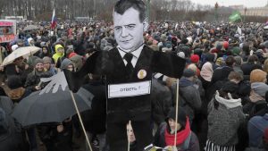 En las siguientes apariciones públicas de Medvédev, ya parecía un hombre roto. Con frecuencia fue captado por las cámaras durmiendo la siesta en actos oficiales, incluso en la ceremonia de apertura de los Juegos Olímpicos de Invierno de Sochi en 2014. Un documental de investigación de Navalni relacionó una red de palacios y viñedos con Medvédev. Él negó las acusaciones, pero a continuación se produjo una oleada de protestas callejeras de quienes consideraban que Medvédev había resultado ser tan sobornable como otros miembros de la élite rusa.